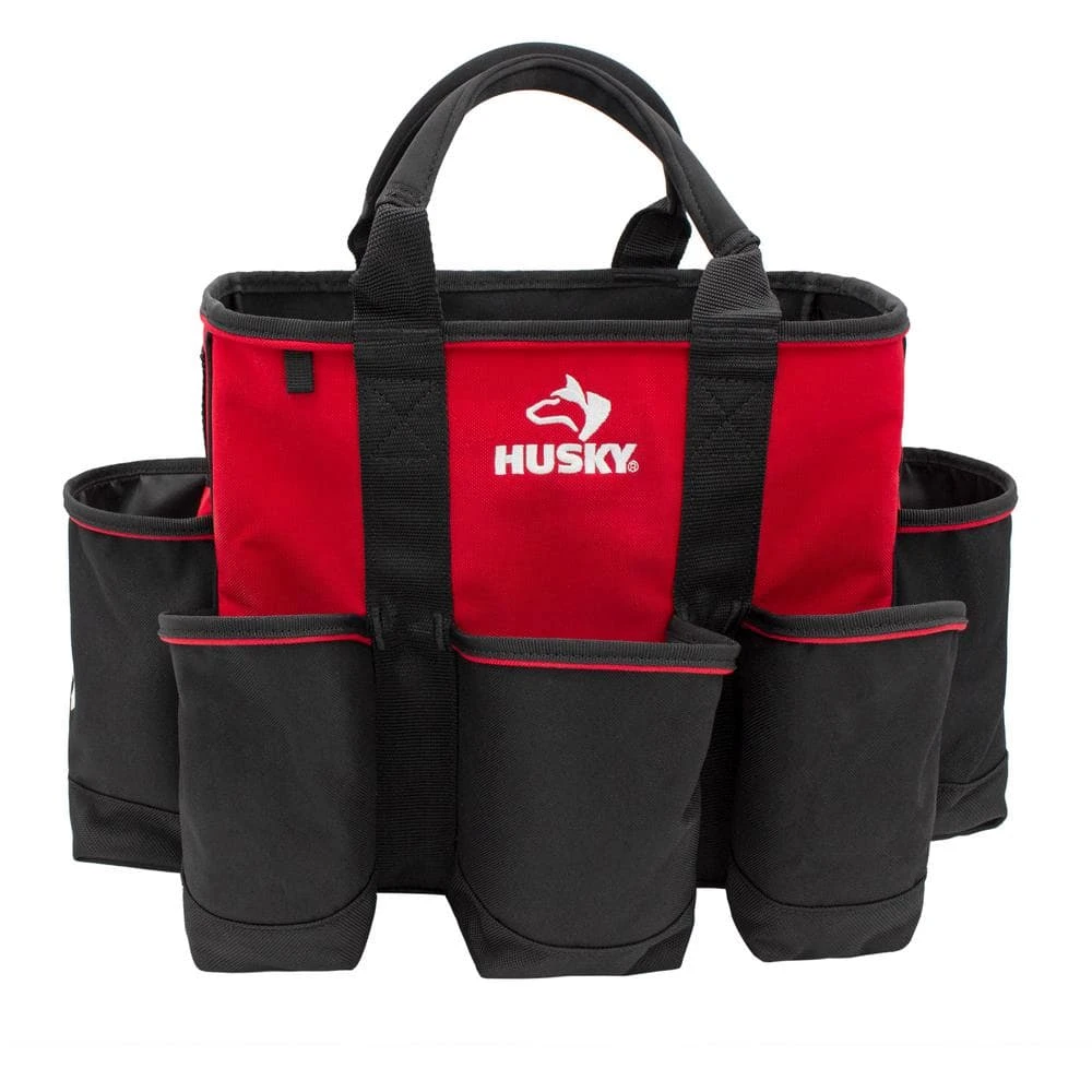 The Husky 14 in. Supply Bag features 15 large pockets to accommodate a variety of tools, supplies and accessories. With a 25 pound load rating, this tool bag can be carried comfortably by the padded handles or fits on top of the 18 in. Husky Rolling Tool Tote. This supply bag is constructed of 600 denier water-resistant material and carries a 3-year limited warranty. This supply bag is great for carrying cleaning supplies, tools, and more.