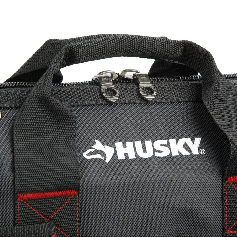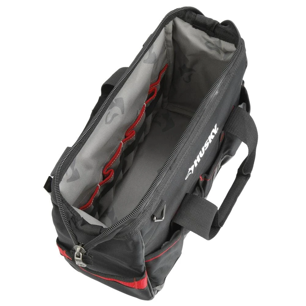 The Husky 14 in. Large Mouth Bag is constructed of heavy-duty 1680D fabric with full reinforced edges for durability. The main compartment features dual lockable security zippers for theft prevention. The outside of the bag features an easy-access tape clip, a glove/rag clip for air-dry storage and 8 external pockets for a range of storage uses. The inside of the bag has an additional 8-pockets with elastic straps to accommodate a wide variety of tools and tool sizes.