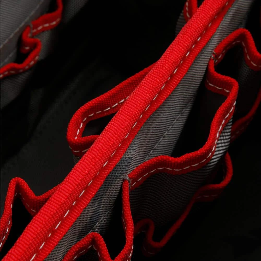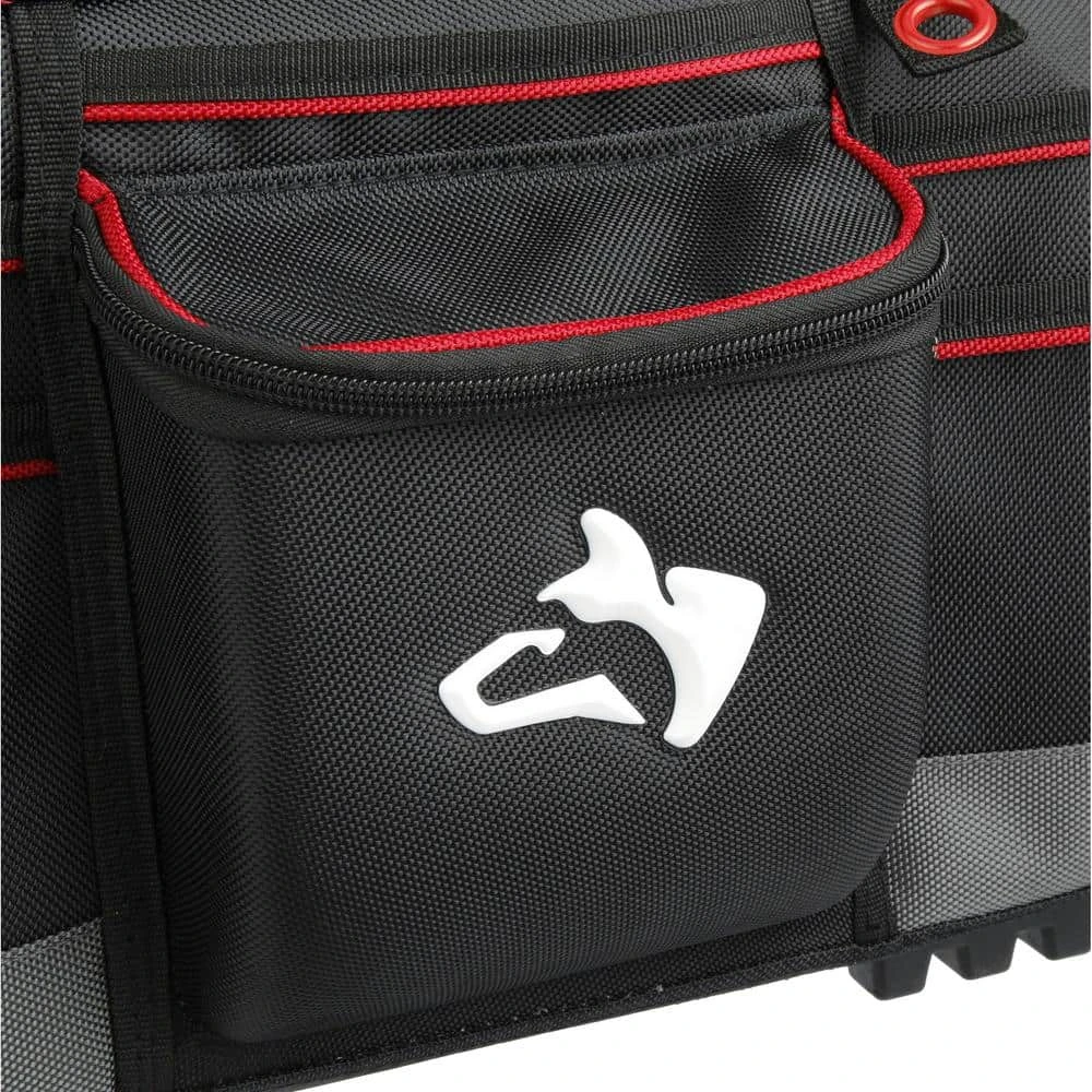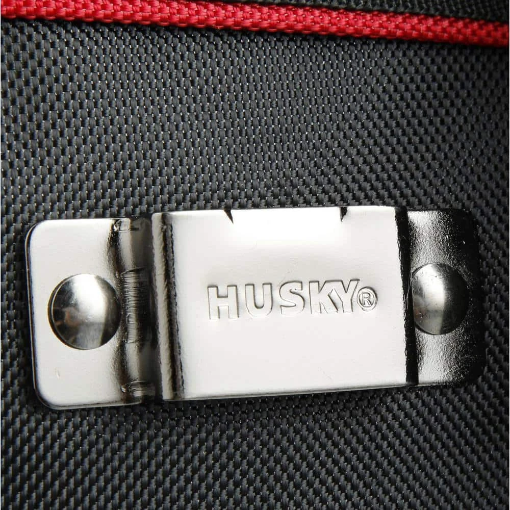 Keep your tools organized and handy with this Husky 16 in. Large Mouth Bag. It features a main compartment with dual lockable security zippers and a hard-sided pocket on the exterior. It also has 11 additional exterior storage pockets, a glove/rag clip for air-dry storage, an easy-access tape clip and a lockable security zipper. This bag will last you over time with a heavy-duty 1680D fabric construction with full reinforced edges. There are five feet on the base and the inside has 25 pockets and elastic straps to hold tools of all sizes.