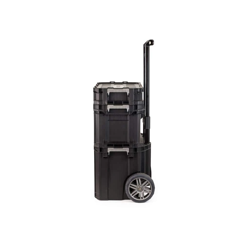 This 22 in. Connect System Rolling Cart features an interconnecting system allowing you to customize the way you transport your tools and accessories. The system features 3-Piece. A rolling cart, toolbox and small parts organizer. The rolling cart base is large for hauling power tools. The rolling cart features 7 in. rolling wheels and strong telescoping handle. The mid tool box is 22 in. W and features a flat lid surface to double as a work surface. The deep pro organizer features 12 removable bins.