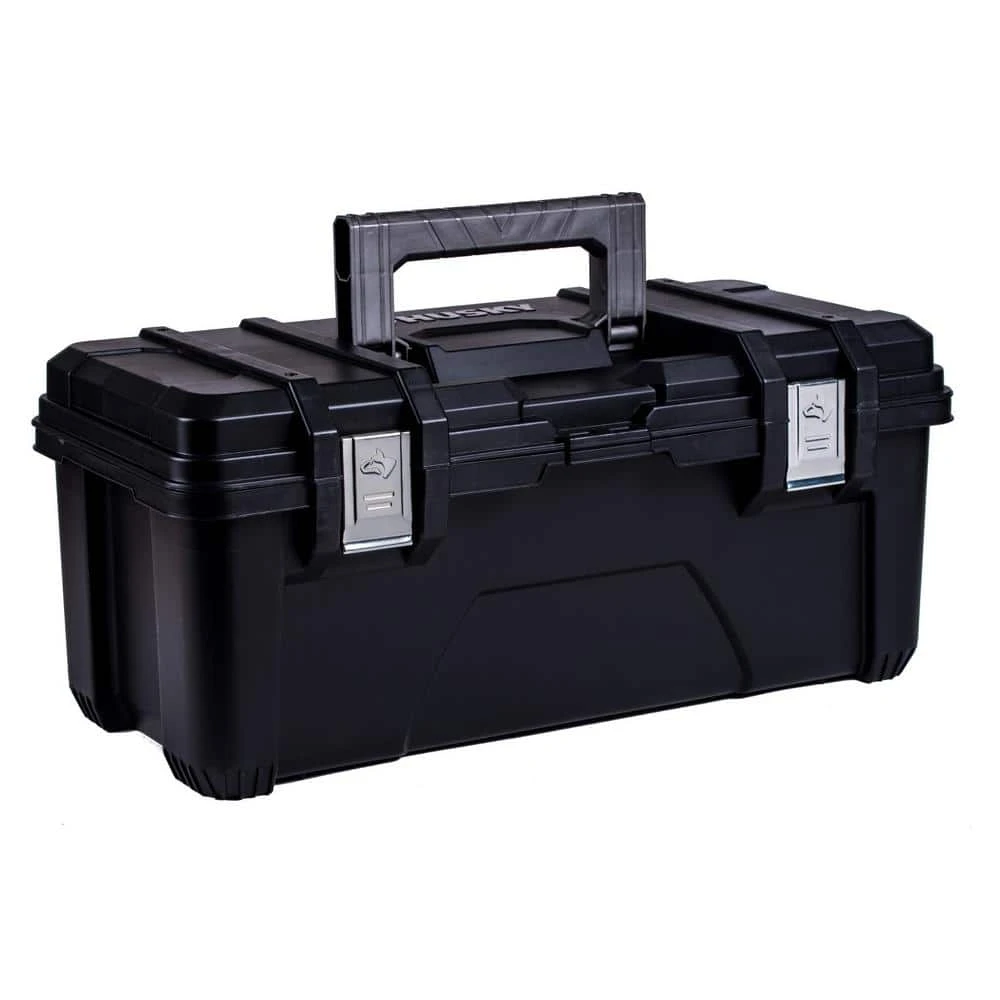 The Husky 26 in. Tool Box is the largest in its size category. This rugged built box, with its removable tool tray and large lid organizers allows both the professional and DIYer to organizer all of their tools for the simplest or toughest of jobs. The built-in padlock eye and dual heavy-duty metal latches will secure your tools where ever you go.