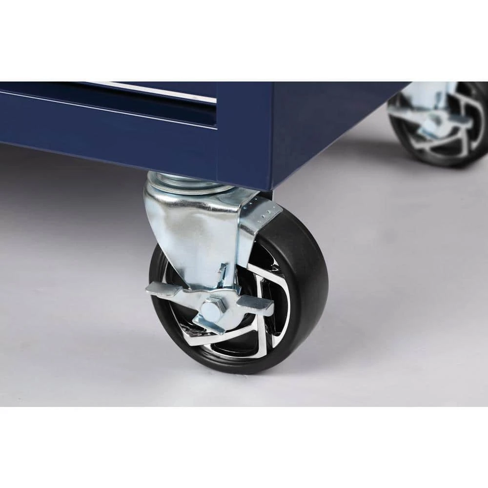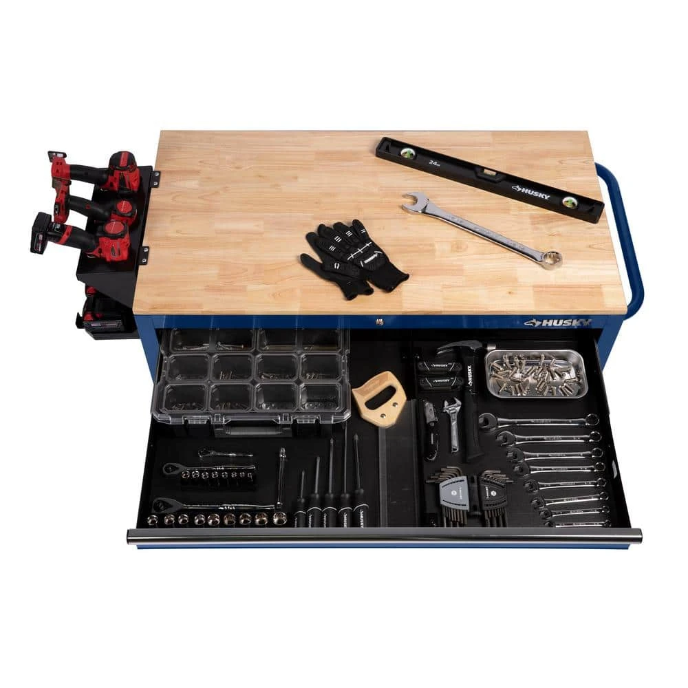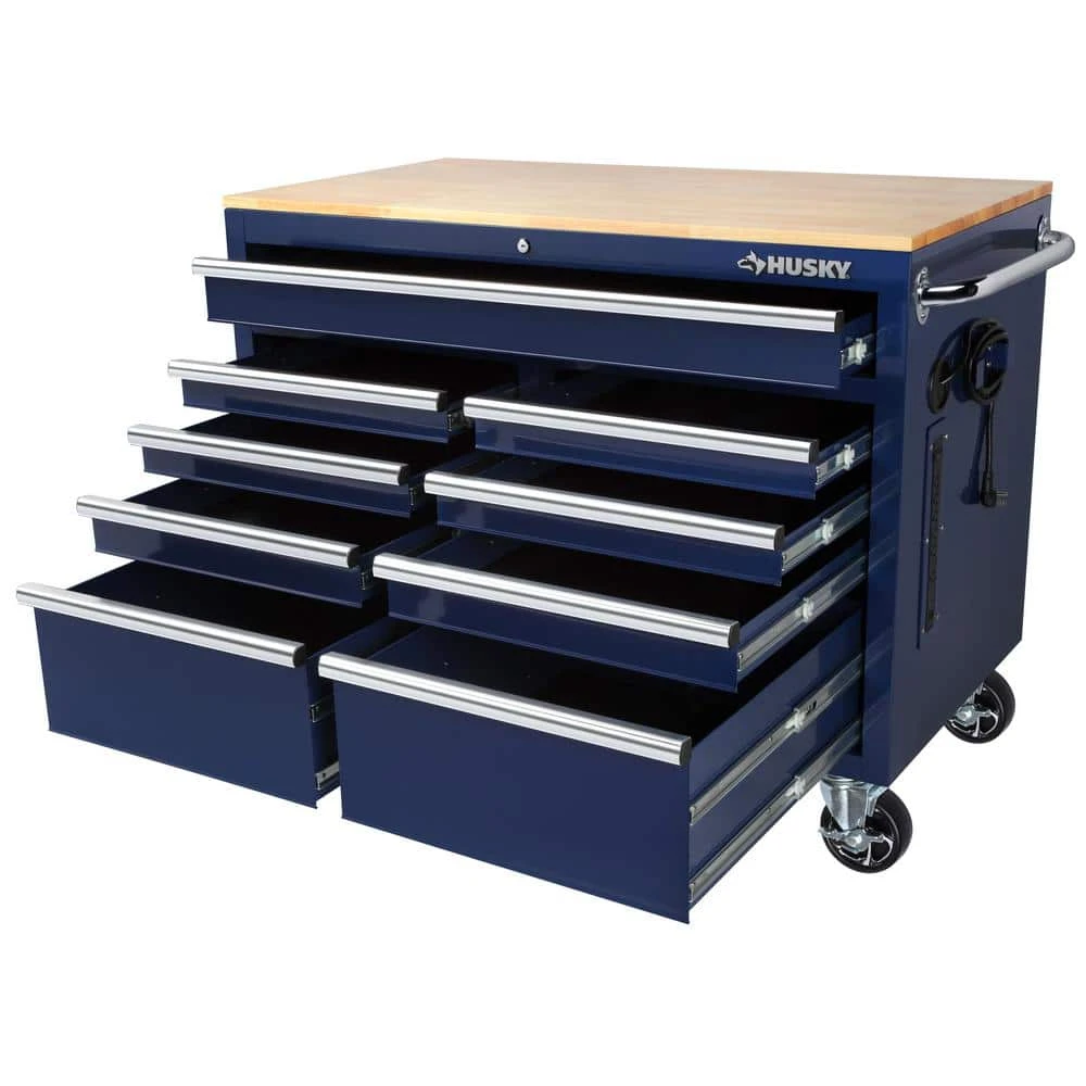The all new Husky Extra-Deep 46 in. 9-Drawer Mobile Work Bench has arrived. This work bench is 24.5 in. D, which creates 36% more storage capacity than traditional 18 in. D units. The extra-depth also means there is a much larger solid wood top to use as a work surface for all your projects. An integrated power strip on the side of the work bench provides easy access to 6 outlets and 2 USB Ports, so your tools and other electronic devices can always be charged up and ready to go. There is plenty of storage options within the work bench inside the 9 lockable 21.7 in. D drawers. Each drawer glides easily on 100 lbs. rated ball-bearing soft-closing drawer slides and the large bottom drawers have an extra-set of slides to accommodate heavier items up to 200 lbs. Each drawer also has a premium pre-cut drawer liner that will protect both your tools and drawers. Finally, the entire work bench can easily move around your work space with four 5 in. x 2 in. casters and large ergonomic push handle.