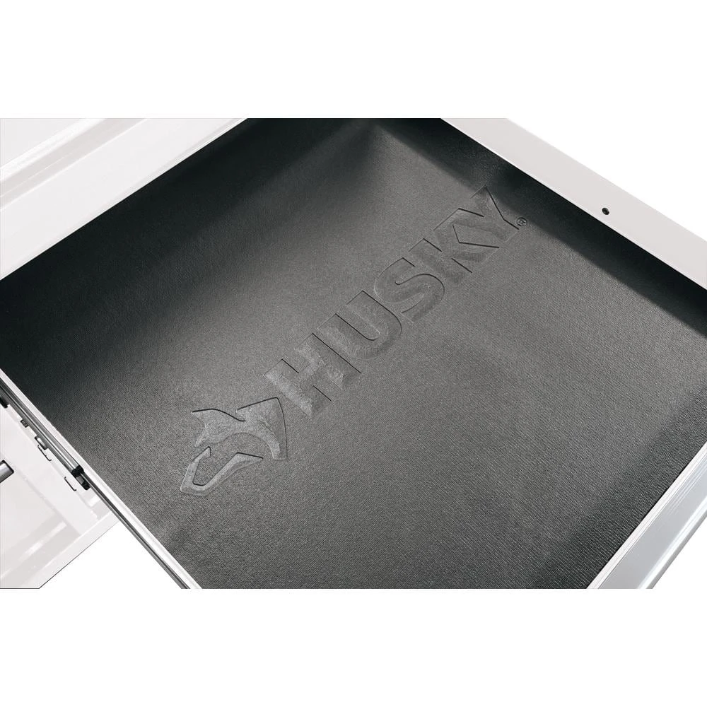 The Husky 46 in. 9-Drawer Mobile Workbench provides a variety of options for your tool storage needs and supports up to 1500 lbs. Measuring 24.5 in. D and offering 19,724 cu. in. of storage capacity, this unit boasts a solid wood top for a stylish yet durable work surface. The full-width drawer easily accommodates longer items while 2, extra-deep bottom drawers are ideal for storing heavy, bulky items and are supported by 100 lbs. rated ball bearing slides. The large, aluminum drawer pulls are protected by end caps for safety and recess flush into the cabinet for a sleek look. For increased mobility, this workbench features a built-in power center with 6 outlets and 2 USB ports to charge power tools and devices. The large, 5 in. x 2 in. casters and steel tubular side handle allow for easy movement to different areas. Drawer liners included to secure items in place.