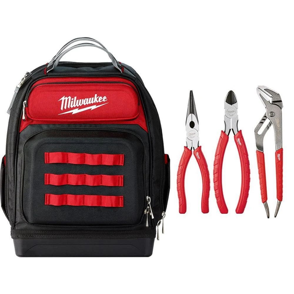 The Ultimate Jobsite Backpack is designed for ultimate durability, protection, and storage. The backpack has the most durable hard molded base on the market with up to 5X better durability than the competition. Constructed of 1680D Ballistic Material and with rugged metal zippers, the backpack provides unmatched durability. With 48 total pockets including 2 hardshell pockets that are designed to protect electronics and equipment from impact, the backpack provides exceptional organization. The padded and breathable load-bearing harness evenly distributes the weight for unsurpassed comfort and jobsite performance with up to 2X more padding than competitive units. The Milwaukee 3-Piece Pliers Kit provides solutions for a wide range of cutting and fastening application. The 10 in. REAM and PUNCH Straight Jaw pliers incorporate exposed metal handles (patent pending) and a precision pliers head for reaming pipe and punching electrical knock outs. The 8 in. Long Nose Pliers feature a 2 in. gripping nose for pulling wire and material through rough-in holes and other tight spaces, as well as an integrated fish tape puller. The 7 in. Diagonal Cutting Pliers feature Iron Carbide Edge hardened cutting edges for up to 2X more cuts and a tapered nose with flush cutting blades, which cut all the way to the tip. Milwaukee pliers feature over-molded comfort grips, which will not peel under jobsite conditions.