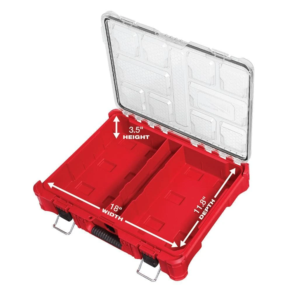 The PACKOUT modular storage system is the industry’s most durable and versatile storage system. The PACKOUT organizer is constructed with impact resistant materials so it can withstand harsh jobsite environments. An IP65 rated weather seal protects tools, accessories, and small parts from rain and other jobsite debris. The organizer’s interior features 10 removable storage bins that are easily mountable on the jobsite for quick access. The transparent lid of the organizer seals the bins to prevent contents from migrating and shifting during transport. Heavy-duty latches and reinforced hinges ensure that the organizer keeps the contents contained and protected. The PACKOUT modular storage allows users to customize and build their own Storage system to easily transport and organize tools and accessories.