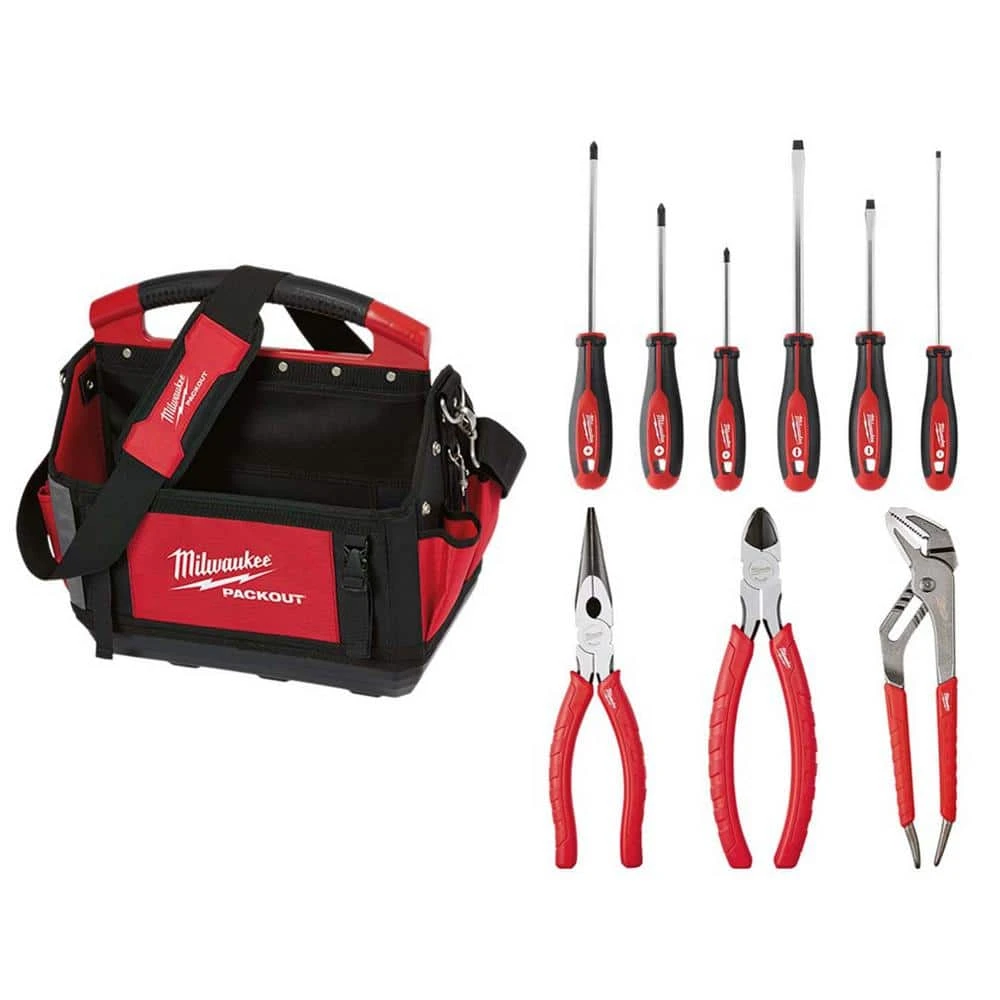 This MILWAUKEE tool bundle includes a 15″ PACKOUT Tote, 3-Piece Pliers Set, and a 6-Piece Screwdriver Set providing the versatility and durability professional users requires. The PACKOUT Modular Storage System connects to all other PACKOUT system components, allowing the user to create customized tool storage solutions. The pliers set has comfort grip includes a 10″ Ream & Punch Straight Jaw Pliers, a 8″ Long Nose Pliers and a 7″ Diagonal Cutting Pliers for a wide range of cutting and fastening applications. The screwdriver set has comfortable tri-lobe handles and wrench ready hex shanks for comfort and efficiency on the jobsite.